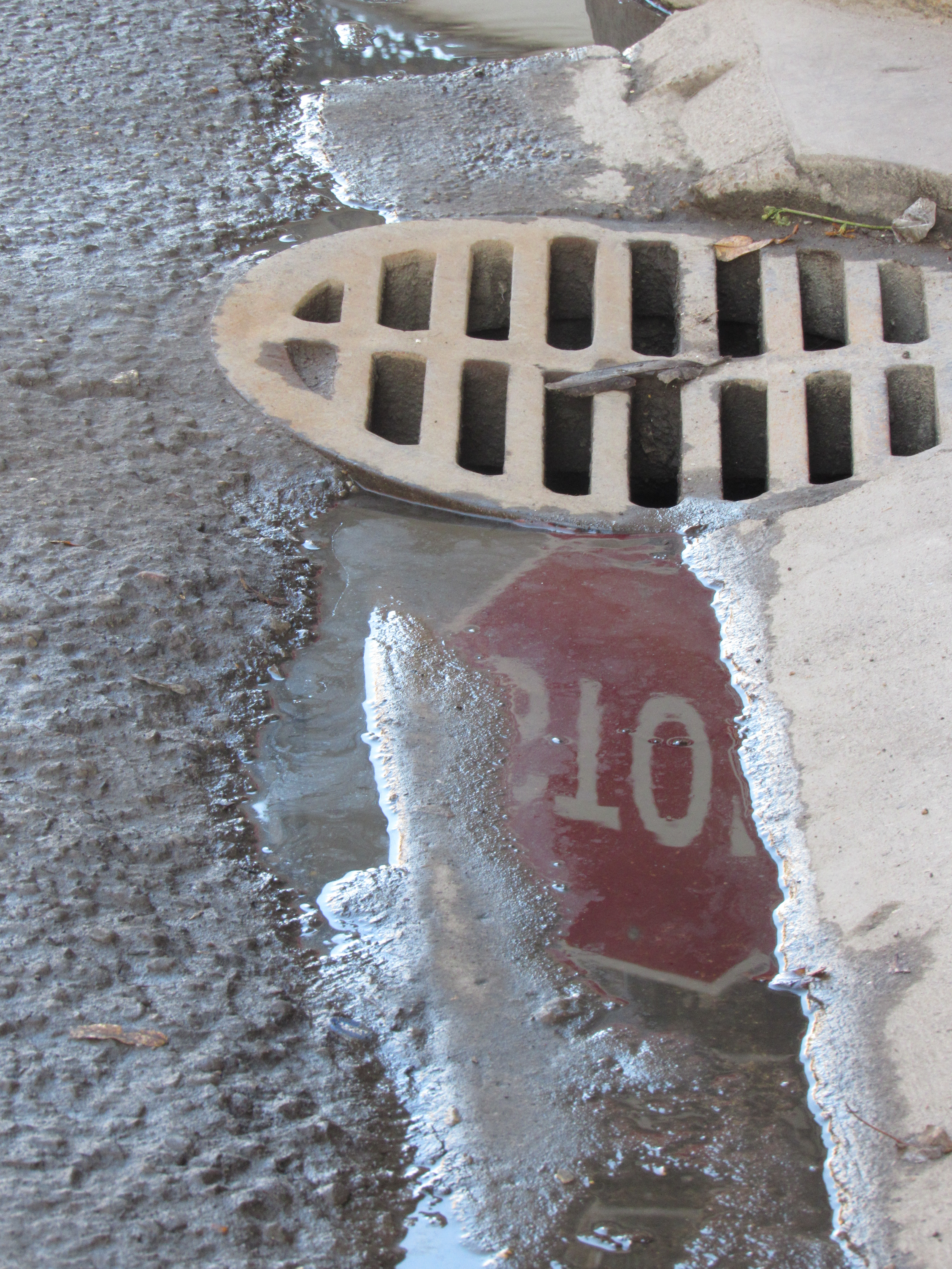 Stop sign reflection in New Orleans street puddle. Photo by Author