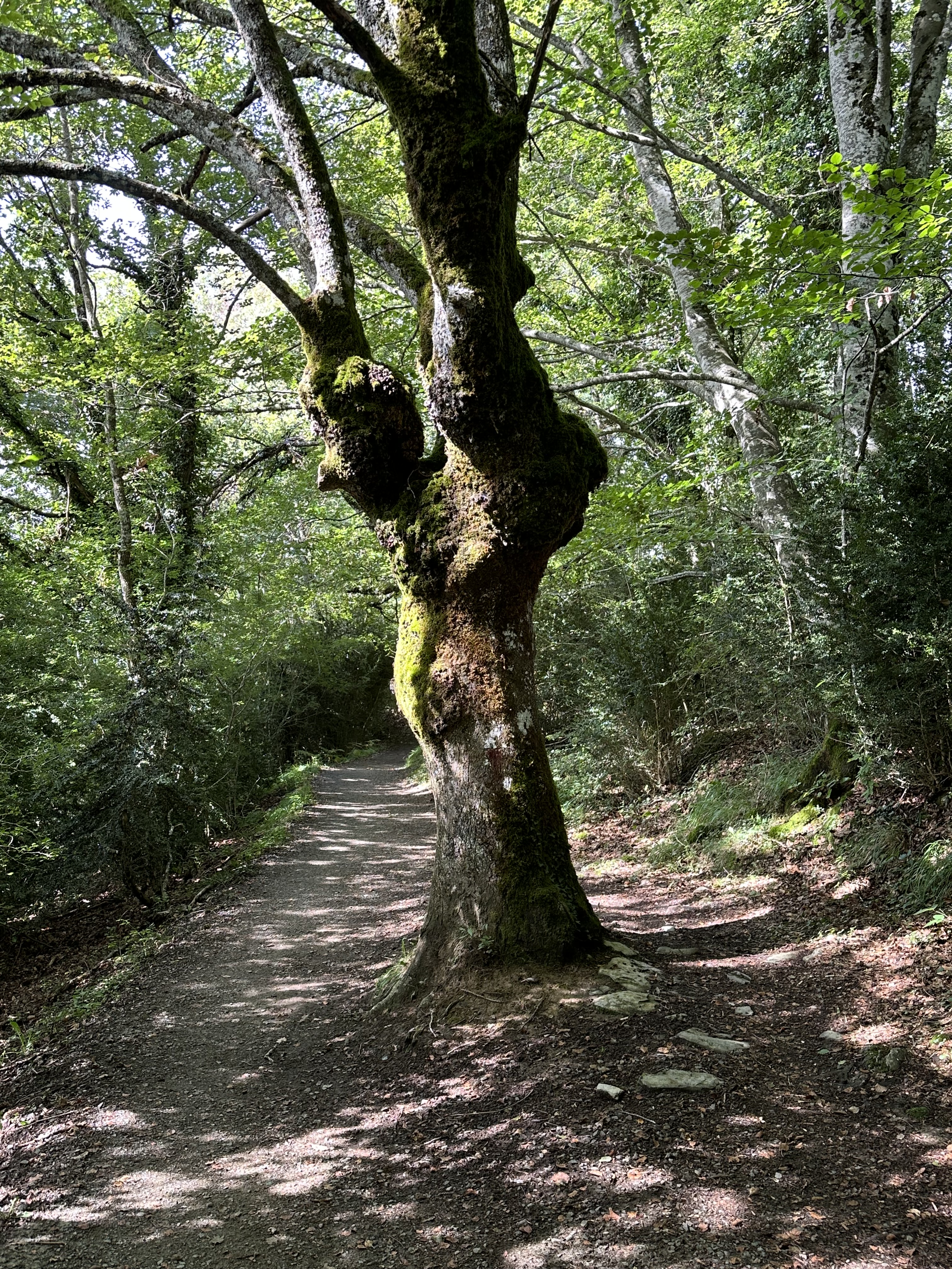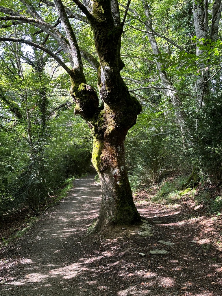 As we emerged from the Mega Hostel known to the faithful as Orreaga, we walked past the local church that proudly refused communion to non-Catholics. Then by the watery morning light, we followed the Yellow Scallops Sigils into a lovely forest of medium sized trees that told me I should be quiet for a while, and to listen to what their leaves had to say. I hadn’t seen a forest quite like it before, and I basked in the sweet peace of cool greenness that a kid from South Texas rarely felt. One tree especially seemed noteworthy, or at least our trail thought so.